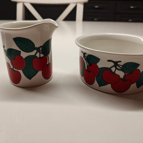 Arabian Kirsikka sokerikko ja kermakko. Inkeri Seppälän suunnittelema kuvio. Valmistettu