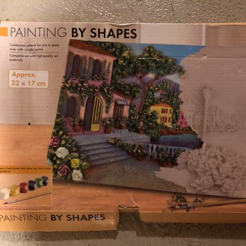 Käyttämättömiä maalaustarvikkeita. Puinen laatikko / maalausteline, setti öljyvärejä, paletti ja 6kpl erikokoisia kankaita. Suurin 116x89 cm