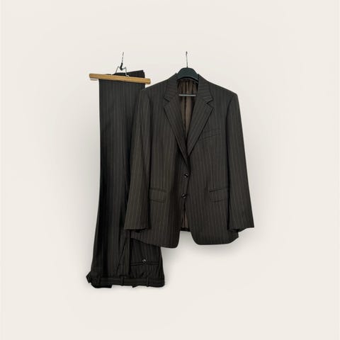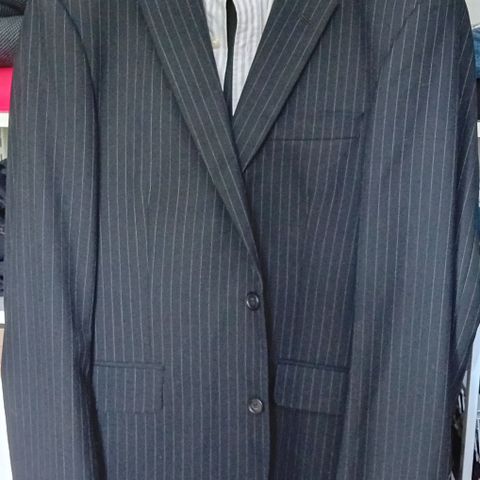 Miesten musta Matíníque -puku kapeilla liituraidoilla. Uudenveroinen, pari kertaa käytetty. Takissa ohuet olkatoppaukset, napilla suljettavat povitaskut, kolminappirivi hihansuissa ja kolme etunappia. Siisti valkoinen kauluspaita mukana. Housuissa syvät sivutaskut ja nappi/solki/vetoketju -sepalus. Takki: 50. Housut: 50/88. Paita: M 39/40.