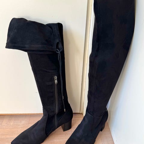 Tamaris saappaat, jossa tekstiilivarsi. 9 cm korko, pohkeen ympärysmitta 34 cm.