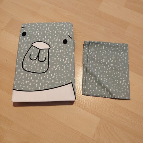 Junior pussilakanasetti suloisella kuvioinnilla, pieni langanpurkautuma jossain kohtaa (en löytänyt enää kuvaa varten).