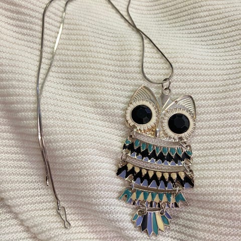 64cm pitkässä ketjussa 9,5cm korkea pöllö. Voin tehdä pöllölle kauniin lahjapaketin jos se menee pukin konttiin. Katsohan muutkin ilmoituksemme, samaan pakettiin mahtuu muutakin postimaksun nousematta