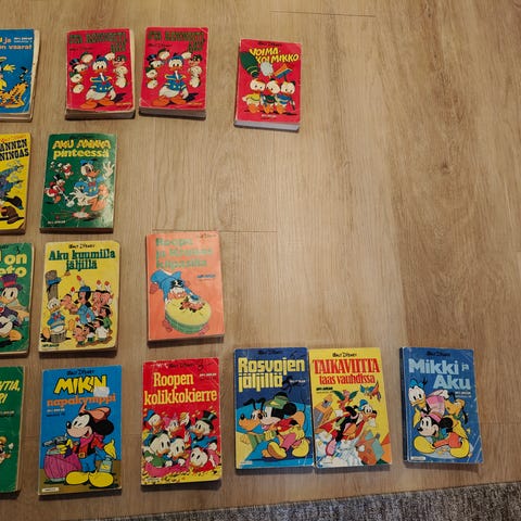 Siinä ois kuusi minun vanhinta Aku Ankkaa, vanhin on numero 27. Käytönjälkiä löytyy mutta suurin osa on ihan siistissä kunnossa.