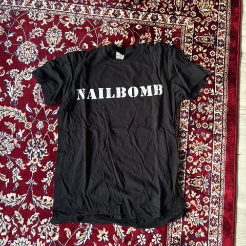 Toisessa hihassa bändin nimi, kuten myös rinnassa. Selässä on isolla yhden heidän klassikkobiisin nimi.