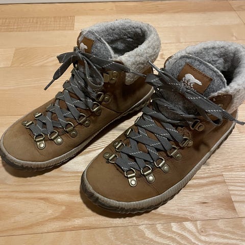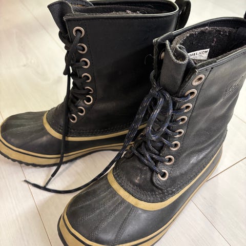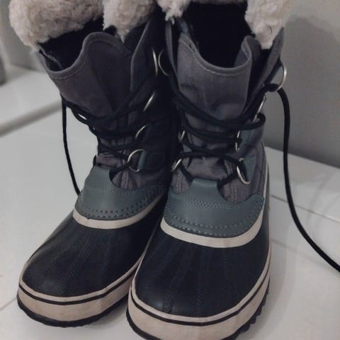 Käyttökunnossa olevat talvisaappaat. Muuten täysin ehjät, mutta neppareita, joilla kiinnitetään nahkalenkki sisäkengästä ulkokenkään, ei ole ulkokengissä yhtään ja sisäkengän neppareista on yksi viallinen. Näkyy kuvassa.
