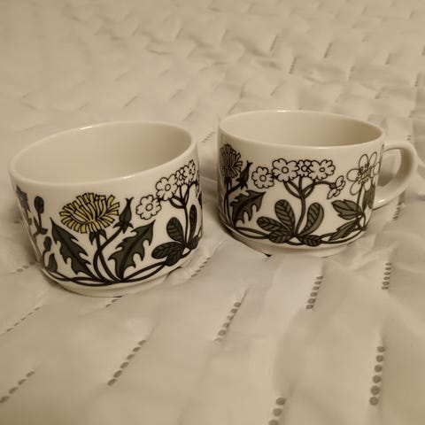 1950-1960 luvulla puhalluskoriste tekniikalla valmistetut. Kahdessa kupissa on tekniikasta johtuen vähän jälkiä. Yhdessä kupissa pieni lohkeama. Nämä näkyy kuvissa. Käytön jälkiä.