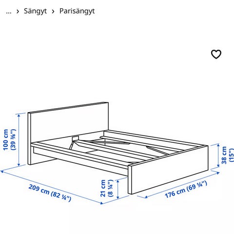Myydään hyväkuntoinen sänkyrunko (mitat kuvassa) ja 2x malm lipastoa 40x55cm, ei kolhuja, täysin ehjä.