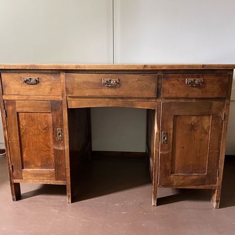 Harmaa vanha työpöytä, jossa musta nahkainen kansipäällys. Antiikkisuuteen kuuluvia pintavikoja. Tukeva, toimivat kaapin ovet ja laatikot.