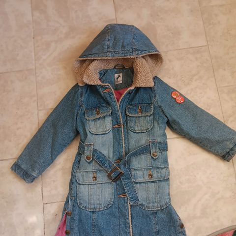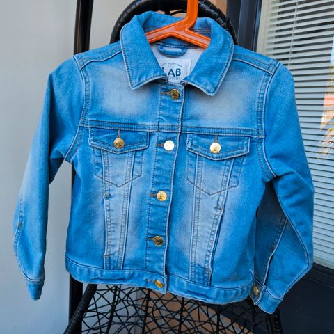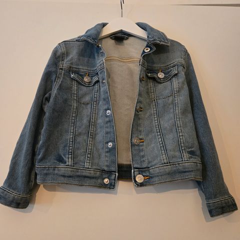 Kakkukuviollinen farkkutakki. Koko 110 ja materiaali 100% puuvillaa.