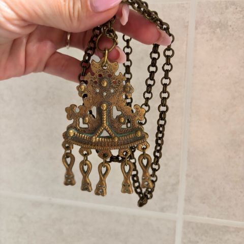 Todella vanha, elämää nähnyt iso Kalevala koru / rintaneula (neula tippunut pois/rikki), käytetty riipuksena, ketju mukaan (ei liene Kalevalan).