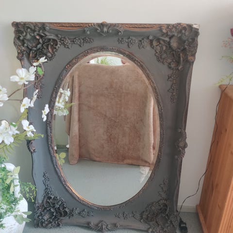 Reunat spraymaalattu itse kultaiseksi ja joitain huonosti maalattuja kohtia on, muuten täysin ehjä peili. Koko olisiko 72x 162 suunnilleen?