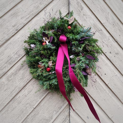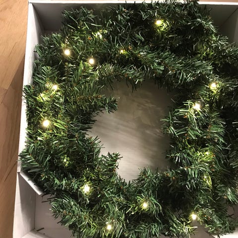 Kaunis vihreä havukranssi jossa paristokäyttöinen lämminvalkoinen valaistus.
