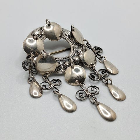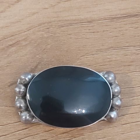 Hopeinen soikea rintaneula, jossa on keskeisenä elementtinä suuri, kiillotettu cabochon-hiottu kivi. Kiven väri on tummanruskea mustilla raidoilla, luoden syvän ja dynaamisen ulkonäön. Korussa on yksinkertainen hopeinen kehys.Mitat on noin 3,5 x 4,5 cmVäri: hopea, ruskea, mustaMateriaali: 916 hopea, kivi tai lasi