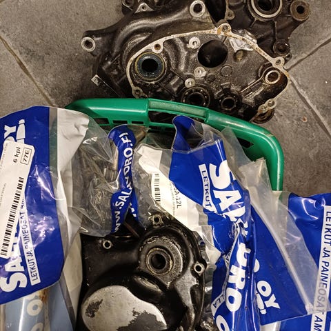 82cc/48mm sylinteri KX80/82. Käy -91>-00 5-pinnapulttiseen kanteen. Pinta hyvä muuten mutta pakoaukon sillan alapäässä murtuma. Harrastelussa menee vielä mutta takuuta en anna koska 2T:n saa rikki helposti jo muutenkin. Lähetyskuluineen 80e toimitan.