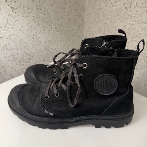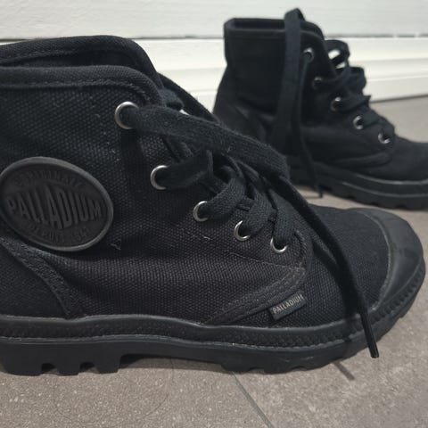 Mustat kankaiset Palladiumit. Hyvässä kunnossa, pohja ei kulunut eikä kangas. Kuvissa ovat hieman likaiset. Nauhat nukkaantuneet.