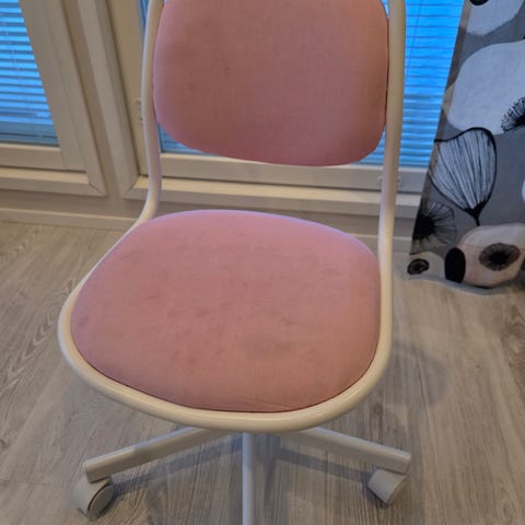 IKEA Lasten tuoli, jossa on punainen muovinen istuin ja selkänoja. Tuolissa on musta säädettävä jalusta ja pyörät, jotka mahdollistavat liikkuvuuden. Sopii lasten käyttöön esimerkiksi työ- tai opiskelupöydän ääressä.