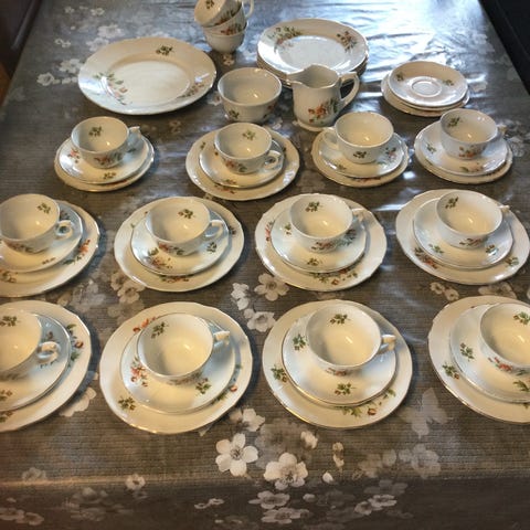 Arabia astiasto, jossa on kukkakuvio. Astiastoon kuuluu erilaisia lautasiaja kulhoja
