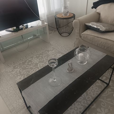 Neliömallinen pöytä, jossa musta kansi ja valkoiset sivut. Pöydässä on avoin säilytystila alapuolella. Jalustat ovat metalliset, mikä lisää pöydän vakautta. Sopii olohuoneeseen tai muuhun tilaan