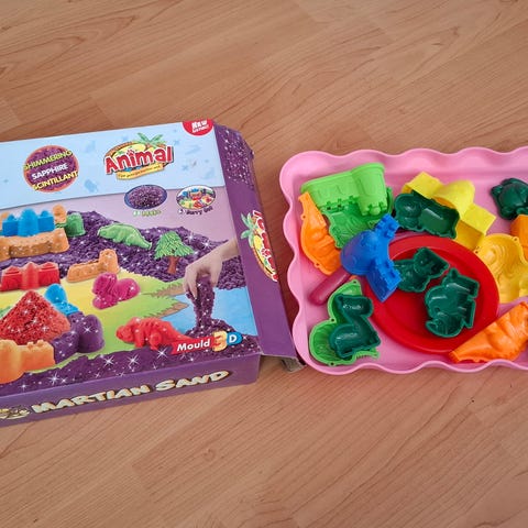 Kineettinen hiekka, irtonaista ja helposti liikkuvaa mutta tiivistyy erilaisiksi muodoiksi ja hahmoiksi.