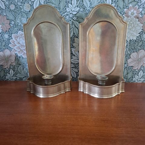 Messinkiset seinälle kiinnitettävät kynttilä lampetit 2 kpl. Vintage. Korkeus 21 cm, leveys 7,5 cm ja ulkoneva seinästä 10cm.