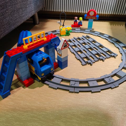 Kuten kuvista näkyy niin todella paljon palasia, eläimiä, hahmoja, junanradan osia sekä vaunuja. Punainen isoveturi on sähköinen ja testattu että toimii. Pakattun siististi zip-lock pusseihin.