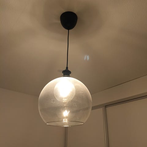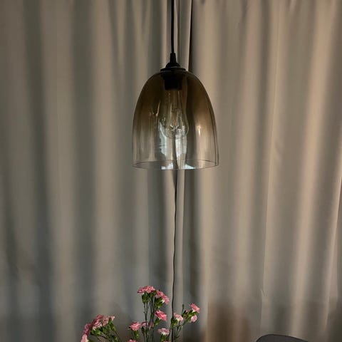 Lasinen riippuvalaisin. Korkeutta saa säädettyä. Lampun saa halutessaan mukaan.