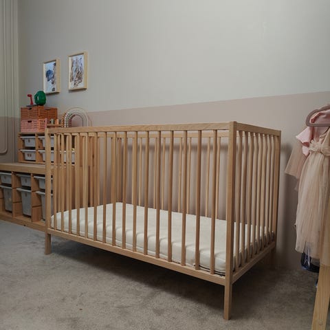 Ikea SNIGLAR pinnasänky (80€) ja SKÖNAST patja (70€). Mukaan myös LEN reunapehmuste (20€).