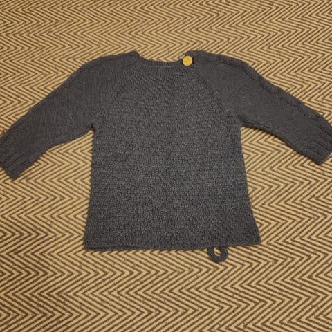 Uutena saatu ja yhdellä käytetty. Sopii tapperoiän (1-3 v / 80-98 cm). Hyvin joustava ja ei kutise. En muista langan nimeä, mutta laadukasta, ei kutisevaa. Merinovillalankaa? Pientä nukkaa ja vatsan kohdalla haalea tahra sekä hihansuissa.