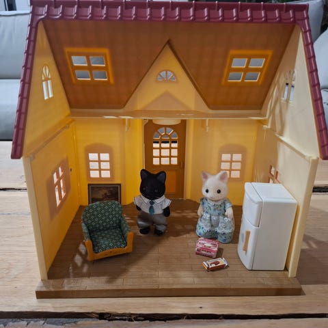 Myydään talo, hahmot ja joitakin kalusteita. Tiskikaapin ovet irti, korjattavissa kun pöytälevyn liimaa paikoilleen.