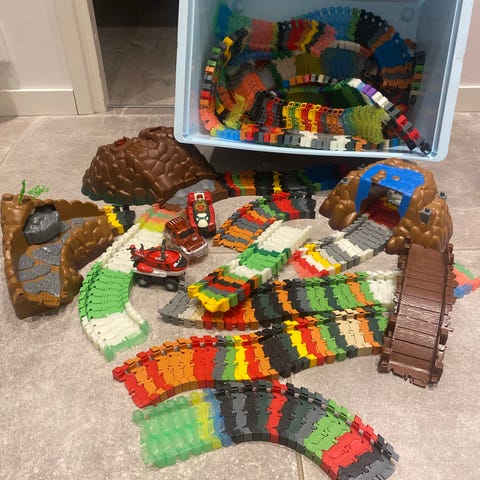 Vanha mutta vielä toimiva rata. Toisen auton patteriluukku pysyy teipillä kiinni.