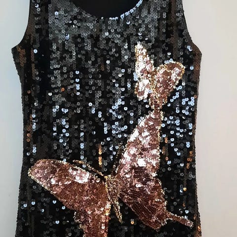 Kaunis kultainen pitsinen/paljettimekko joka joustaa hyvin vyötäröltä. Käytetty S-M kokoisella