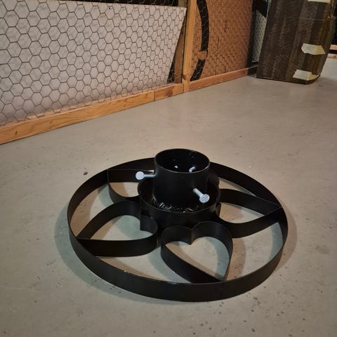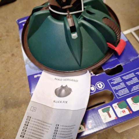 Uuden veroisessa kunnossa oleva Klick Fix joulukuusen jalka. Kuuse kiristys onnistuu helposti rullan avulla