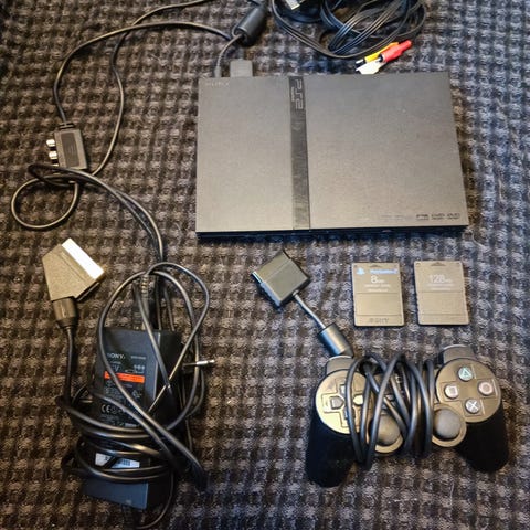 PlayStation 2 SLIM-pelikonsoli + ohjain + muistikortit