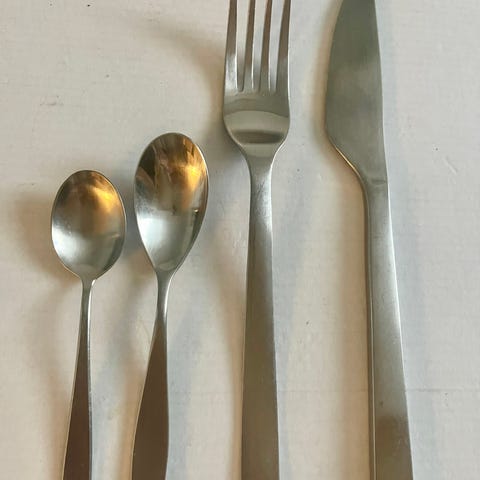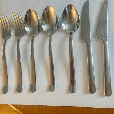 Käytetyt mutta edelleen toimivat, ainoastaan setistä puuttuu yksi pikkulusikka. Eli pakettiin kuuluu 15kpl ruokavälineitå ja kakkulapio.