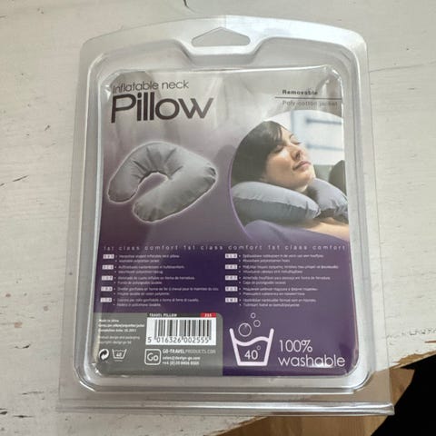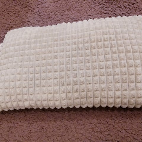 Hyväkuntoinen lieriön (halkaisijaltaan 20 cm) muotoinen niskatyyny, jossa päällinen irrotettavissa. Sisus on vaahtomuovia(kuvassa). Vetoketju ehjä.