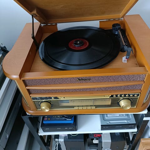 Hihnavetoinen levysoitin missä kolme nopeutta.