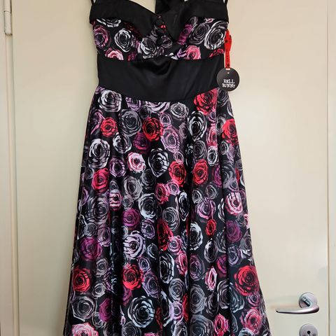 Uudenveroinen mekko, materiaali paksumpaa satiinia. Mekon alaosassa on pitsikuviointi kankaan pinnassa. Mekossa on myös kaksi taskia ja irroitettavat olkaimet.
