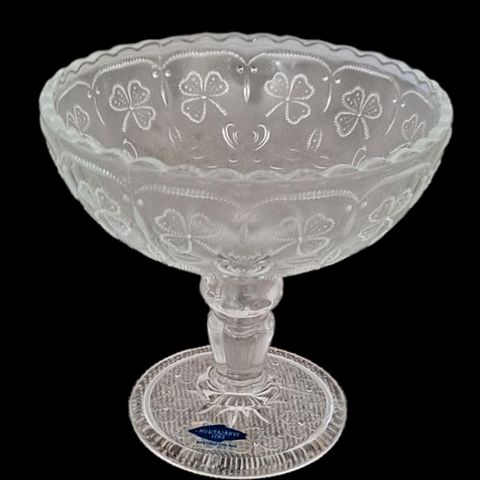 Nuutajärven Apila jalallinen tarjoiluvati. Korkeus noin 14 cm ja halkaisija 25cm. Kerttu Nurmisen suunnittelema. Tämä on ehjä ja hyväkuntoinen, joku käytönjälki saattaa löytyä, mutta ei mitään silmiinpistävää. HP. 20€