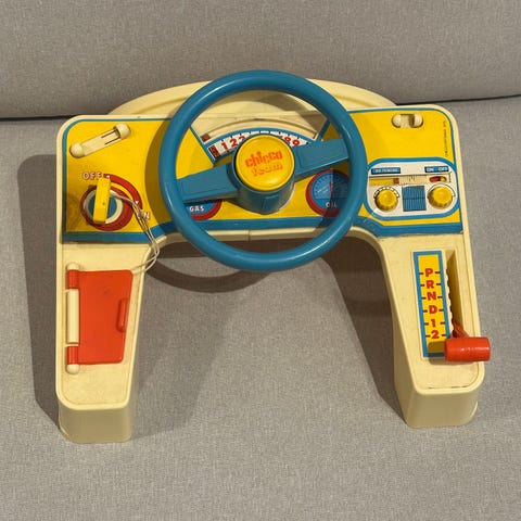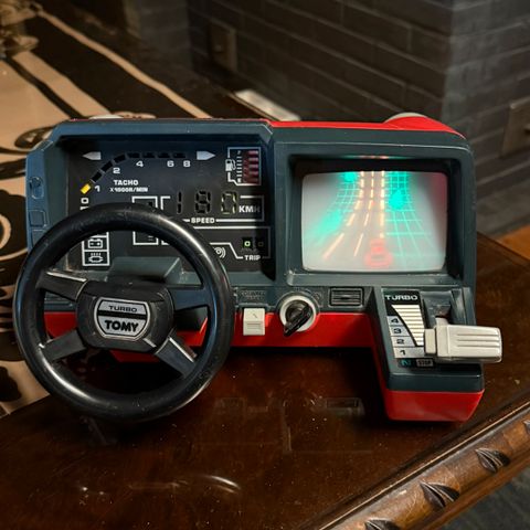 Lasten ajosimulaattori 1980-luvulta. Kaikki osat tallessa. Veivistä auton ääntä, patterit hapettuneet sisälle, joten valon vilkkumaan saamisesta ei ole takeita. Hyvässä kunnossa muuten ikäisekseen.