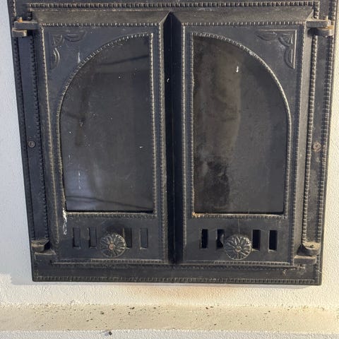 Valurautainen takkaluukku. Lasitja kehikko ovat ehjät, oikean puoleisesta luukusta puuttuu tiivistenaru.