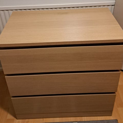 Ikea lipasto, jossa on kolme laatikkoa. Väri valkoinen, materiaali puu.