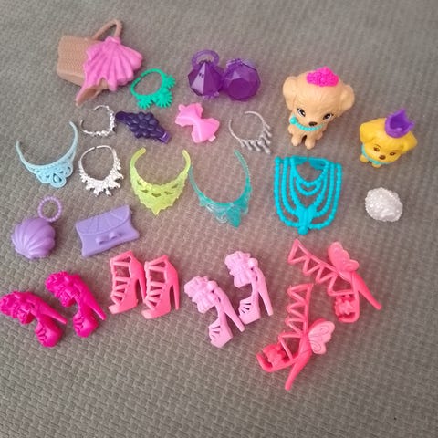 Barbie nukke, joka on pukeutunut harmaaseen mekkoon mustilla kuvioilla ja vyöllä. Nukke soveltuu lasten leikkeihin.
