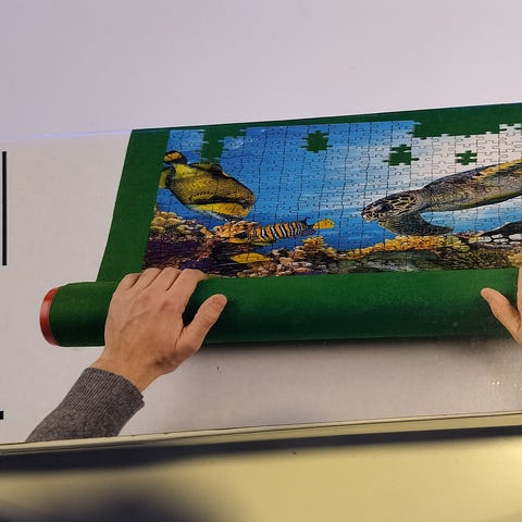 Muutaman kerran käytetty palapelimatto, olikin omiin tarpeisiin turhan suuri. Mahtuu 1000-3000 palan palapeli hyvin. Lisäksi ilmatäytteinen putki jonka ympärille palapelin voi rullata sekä kumilenkit kiinnitykseen.