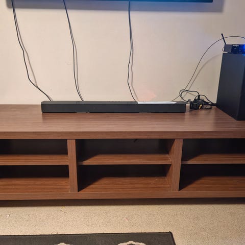 Kalustetoimittajalla mittatilaustyönä teetetty TV-taso kalustelevystä (väri tammi), jossa maitolasiliukuovet alumiinikiskoilla. Kannessa siisti pyöreä reikä johdoille, myös tason sisällä vastaava aukko johtojen vientiä varten ja takaseinässä isompi aukko johtojen ulosvientiä varten. Kalustelevy on ajan saatossa hieman ”väsynyt” ja ovien sujuvan liikkumisen varmistamiseksi tason sisäpuolelle on laitettu irtopalikat rakennetta tukemaan. Myös jalat on lisätty jälkikäteen kun taso laskettiin seinältä lattialle. Jalat voi halutessaan ruuvata irti. Vain nouto.
