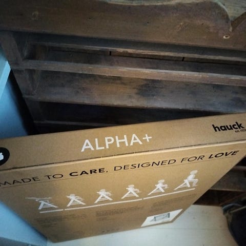 Hauck syöttötuoli. Lasten syöttötuoli, jossa säädettävä istuin ja jalkatuki. Mukana turvavyöt, syöttötuolin kaari ja irrotettava tarjotin. Syöttötuolin kaaren ja tuolin väliin tuleva nauha hukkunut. Maalipinnassa pientä kulumaa.