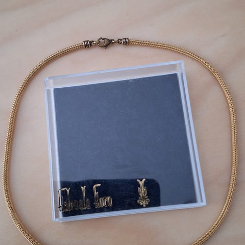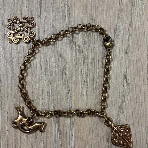 Ohuesta pronssilangasta punotussa verkkoketjussa on pronssista valetut päätydopit ja papukaijalukko. Punoksen paksuus 3 mm.