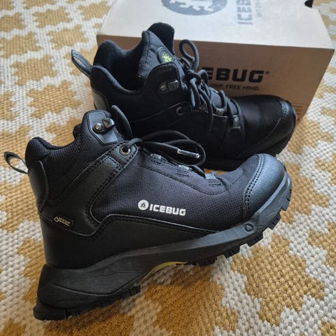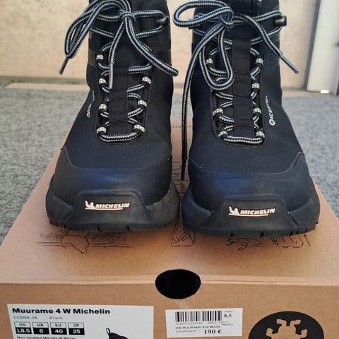 Kaksi kertaa pienen lenkin jalassa olleet vedenkestävät pitopohjakengät. Olikin itselle pienet. Täydelliset liukkaille vesikeleille, koska pitoa on hyvin ilman rapisevia nastoja.