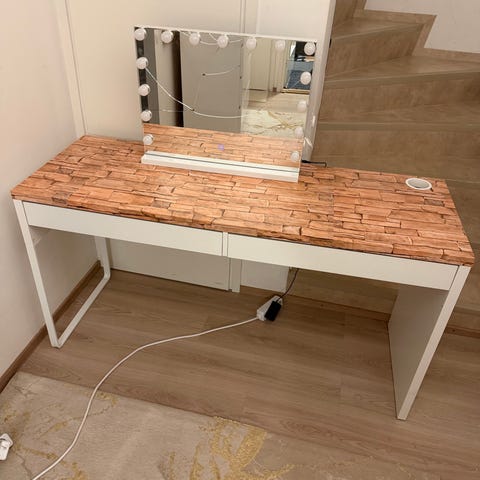 Peili, meikkipeili, pöytä, meikkipöytä, meikkauspöytä, ikea, kokonaisuus, meikkaus, valot, työpöytä, setti, lindby, kabomba, bestå burs, valaisin