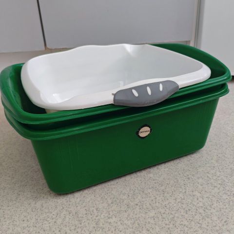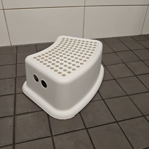 Muovinen jakkara saunaan, pesuhuoneeseen tai kylpyhuoneeseen. Pesty. Ollut jo hetken käyttämättömänä pesutornin päällä, jaloissa kalkkikertymää
