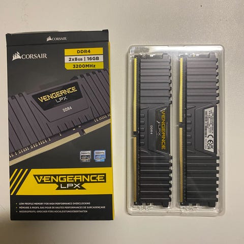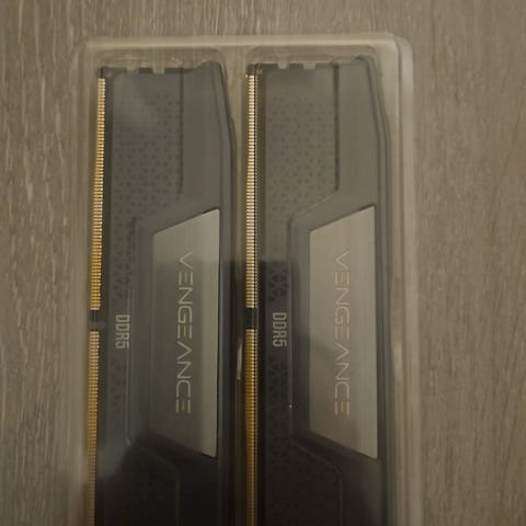 Corsair Vengeance DDR5 RAM-muistit, yhteensä 2x8 16 gigatavua. Sopii tietokoneen muistin laajentamiseen ja parantamiseen.